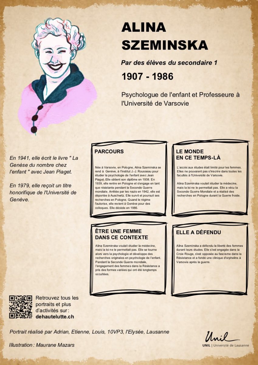 Alina Szeminska a défendu la liberté des femmes durant leurs études. Elle s’est engagée dans la Croix Rouge, s’est opposée au fascisme dans la Résistance et a fondé une clinique d’orphelins à Varsovie après la guerre.