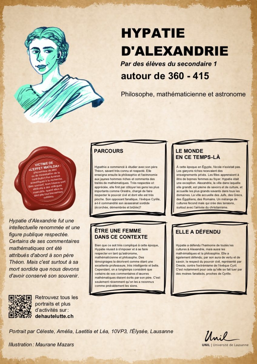 Bien que ce soit très compliqué à cette époque, Hypatie réussit à s’imposer et à se faire respecter en tant qu’astronome, mathématicienne et philosophe. Des témoignages la décrivent comme étant une excellente professeure, très intelligente et belle. Cependant, on a longtemps considéré que certains de ses commentaires d’œuvres mathématiques étaient écrits par son père. C’est seulement récemment qu’on les a reconnus comme probablement les siens.